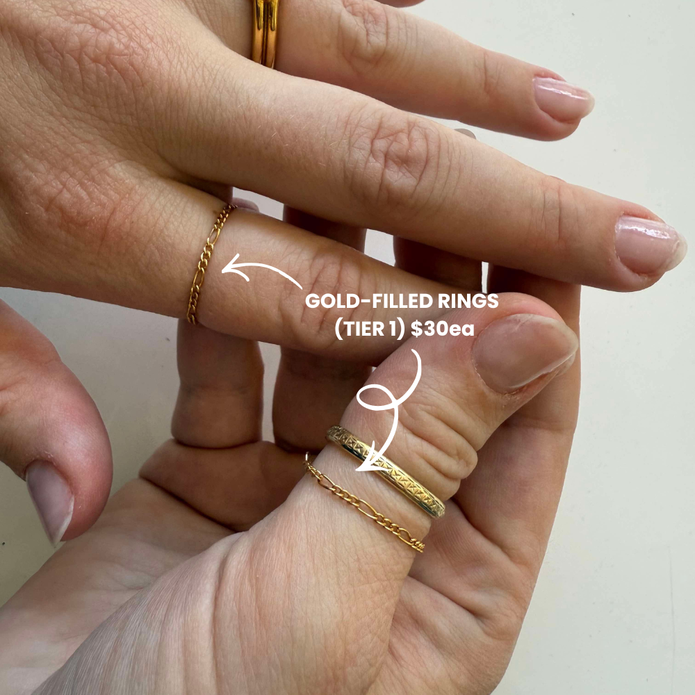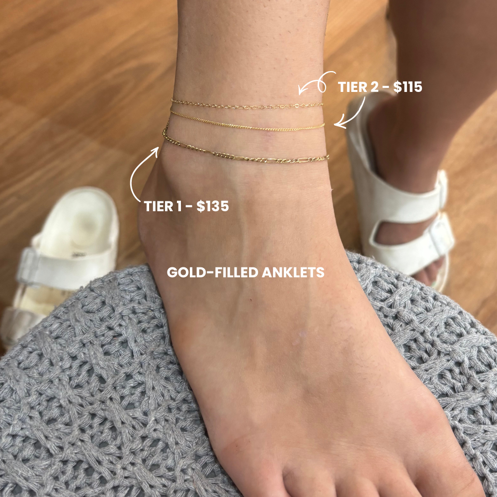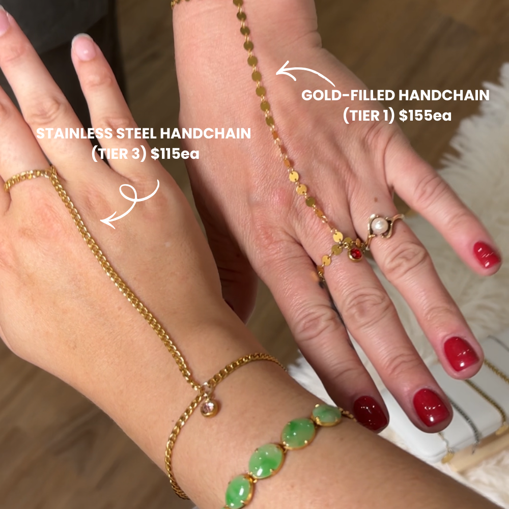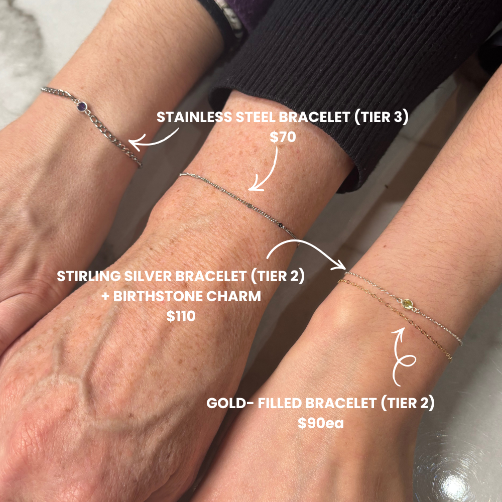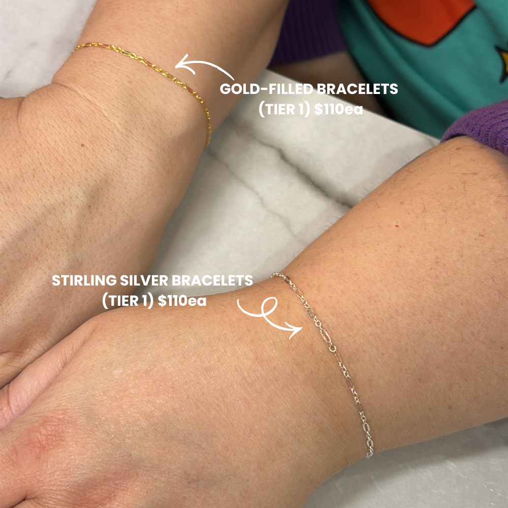 Our permanent jewellery pricing is based on tiers, which simply reflect the chain style and thickness (so you can choose something super dainty, more detailed, or a little more luxe).
